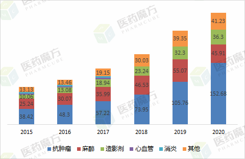 在恒瑞2020年的亿元营业收入中,肿瘤药品贡献了152.68亿元的份额。恒瑞的收入增长主要驱动因素为以下方面:肿瘤药品销售额较去年增长44.37%,造影剂产品销售额较去年增长12.4%,麻醉产品同比下降16.63%。心血管和消炎收入未单列。