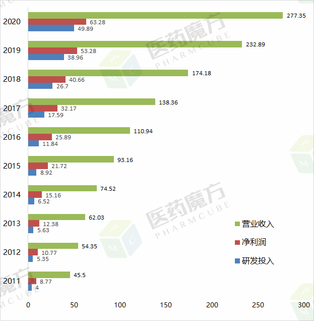 4月19日,恒瑞公布2020年年报,全年营业收入277.35亿元,同比增长19.09%;归属于上市公司股东的净利润63.28亿元,同步增长18.78%;研发费用49.89亿元,同比增长28.04%,占营业收入的比重达到17.99%。