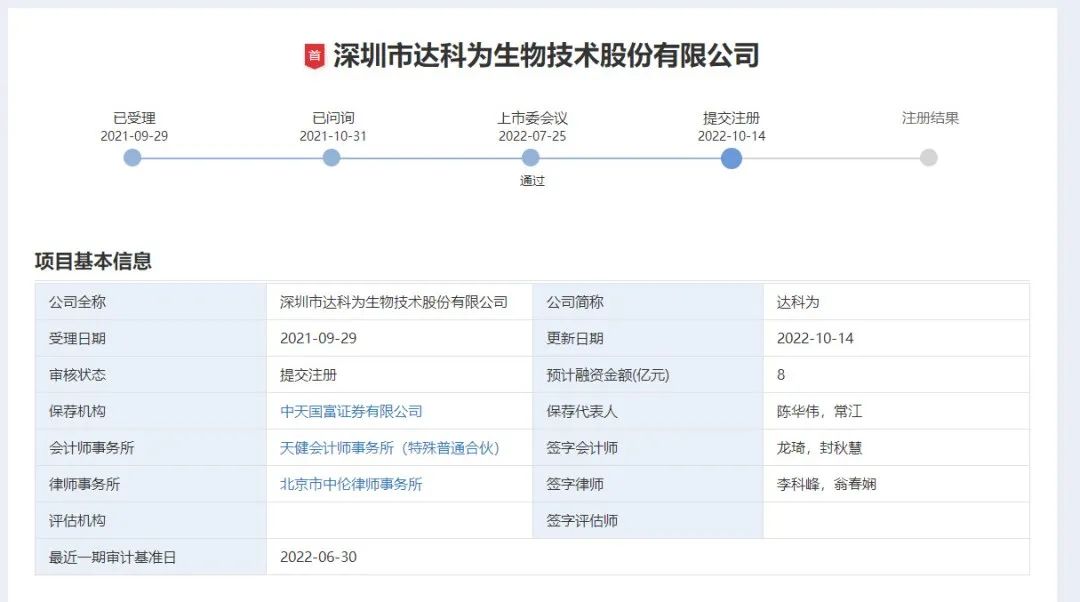 10月14号,深圳市达科为生物技术股份有限公司在完成了上市过会被批准后,又提交了注册。达科为距离上市敲钟,只差临门一脚!