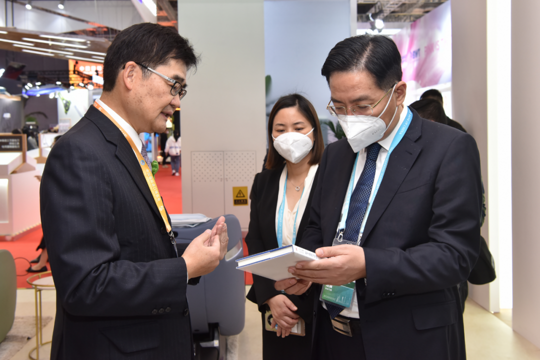 在进博会展馆内,赵建军一行走访部分参会企业,并与国内外客商交流洽谈。