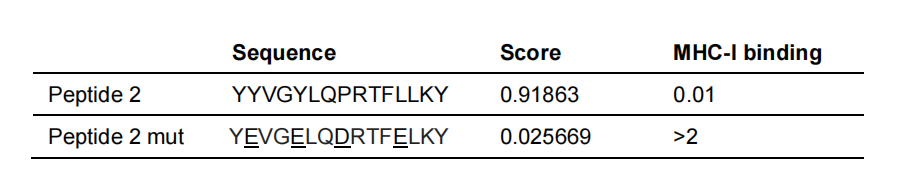 表1:IEBD比较Peptide2及氨基酸序列突变后的Peptide2与MHC-I分子的亲和性