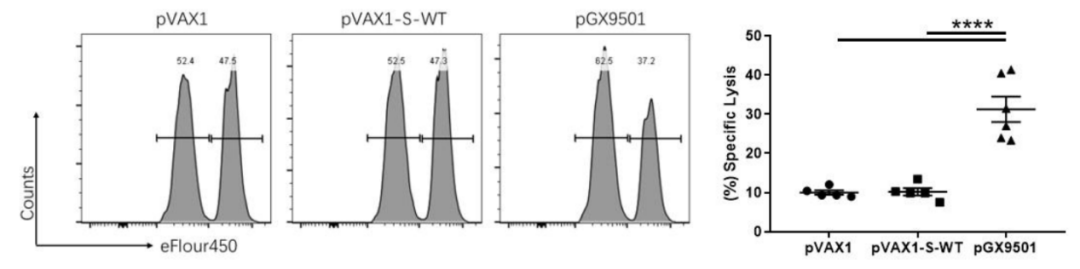 图2:体内CTL杀伤实验,相对于对照空载体pVAX1和野生型pVAX1-S-WT DNA疫苗免疫组,Pool 1检测出pGX9501免疫的小鼠显著的抗原特异性CTL反应