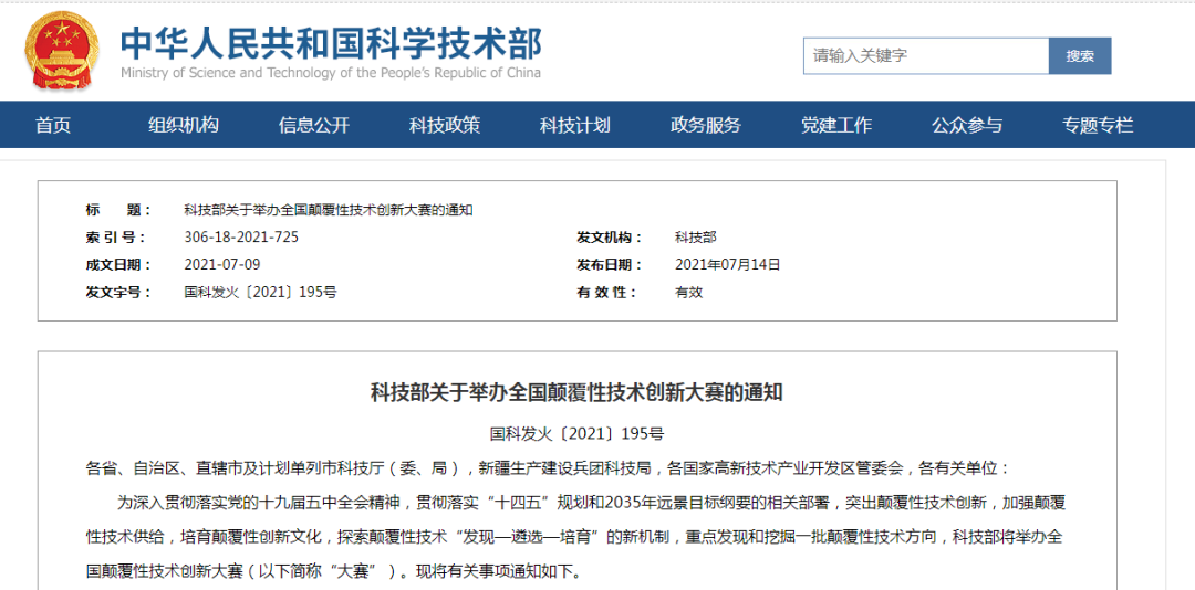 科技部关于举办全国颠覆性技术创新大赛的通知