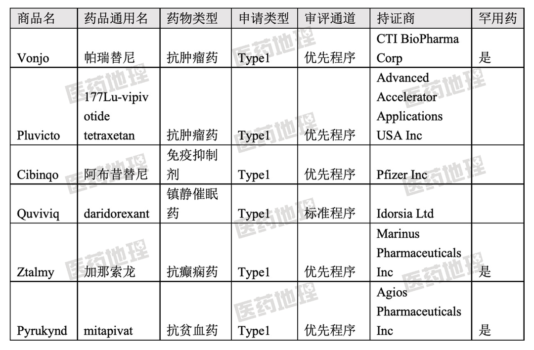 获批的35个NDA药品中,值得重点关注的是6个Type1-新分子实体类新药,其中包含3个抗肿瘤及免疫调节剂:Vonjo(帕瑞替尼)是对JAK2、IRAK1和CSF1R具有特异性的口服激酶抑制剂,用于血小板计数低于50× 109/L的原发性或继发性骨髓纤维化;Plucicto(177Lu-vipivotidetetraxetan)则用于治疗前列腺特异性膜抗原(PSMA)阳性转移性去势抵抗性前列腺癌(mCRPC),是FDA批准的首个针对mCRPC患者的靶向放射性配体疗法;Cibinqo(阿布昔替尼)为JAK1抑制剂,用于治疗成人难治性中度至重度特应性皮炎(AD)。