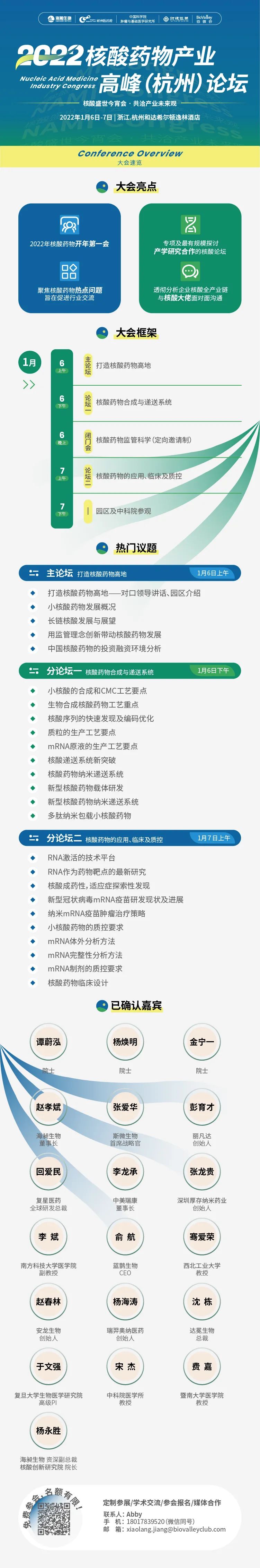 为透析核酸药物全产业链,促进产学研融合,促进中国核酸药物产业化发展,由杭州医药小镇、中国科学院肿瘤与基础医学研究所指导,海昶生物主办,财通证券协办,佰傲谷承办的2022核酸药物产业高峰(杭州)论坛(简称NAMI)将于2022年1月6-7日在杭州举办,大会信息如下: