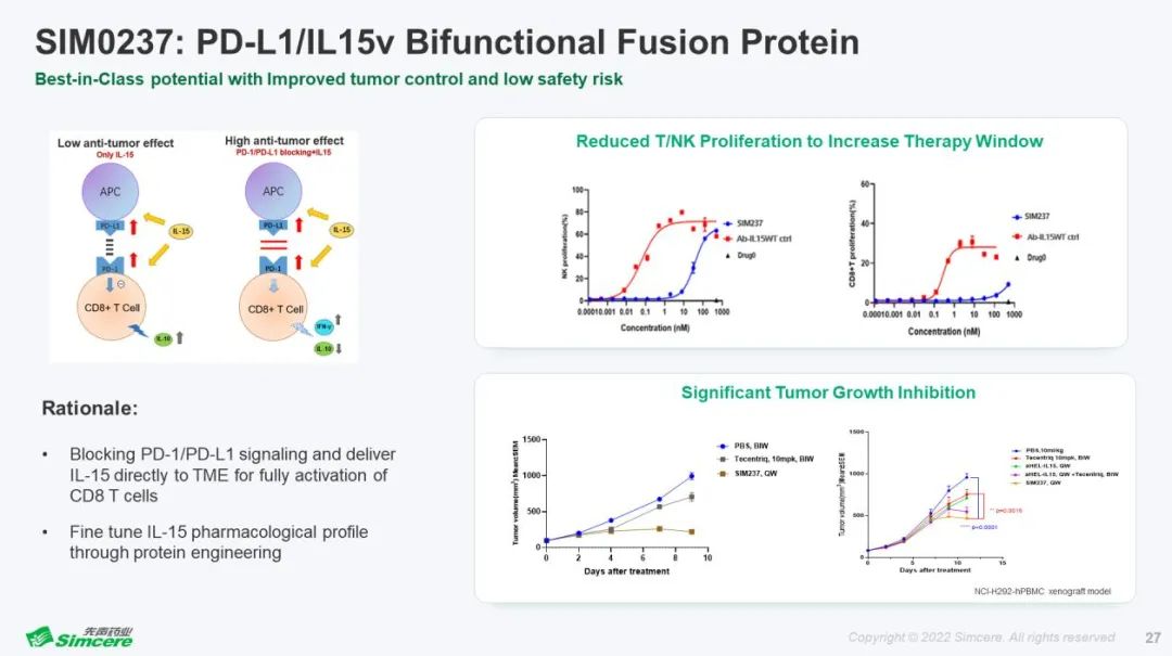 SIM0237是先声药业利用其蛋白质工程技术平台开发的一种PD-L1/IL15v双功能融合蛋白,也是一款经突变减毒获得较宽治疗窗口的潜在best-in-class抗肿瘤药物。其作用机制为通过结合PD-L1阻断PD-1/PD-L1免疫抑制通路,同时将IL-15直接递送至肿瘤微环境,激活CD8+T细胞和NK细胞,从而起到解除免疫抑制和激活免疫系统的双重协同作用。