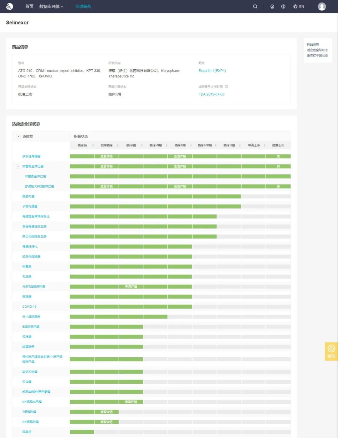 2019 年 7 月,FDA 批准 selinexor 联合低剂量地塞米松用于治疗难治复发性多发性骨髓瘤(rrMM)患者。2020 年 6 月,再次获 FDA 批准单药治疗难治复发性弥漫性大B细胞淋巴瘤(rrDLBCL)患者。同年 12 月,又获 FDA 批准联合治疗既往接受过至少一次治疗的多发性骨髓瘤患者。