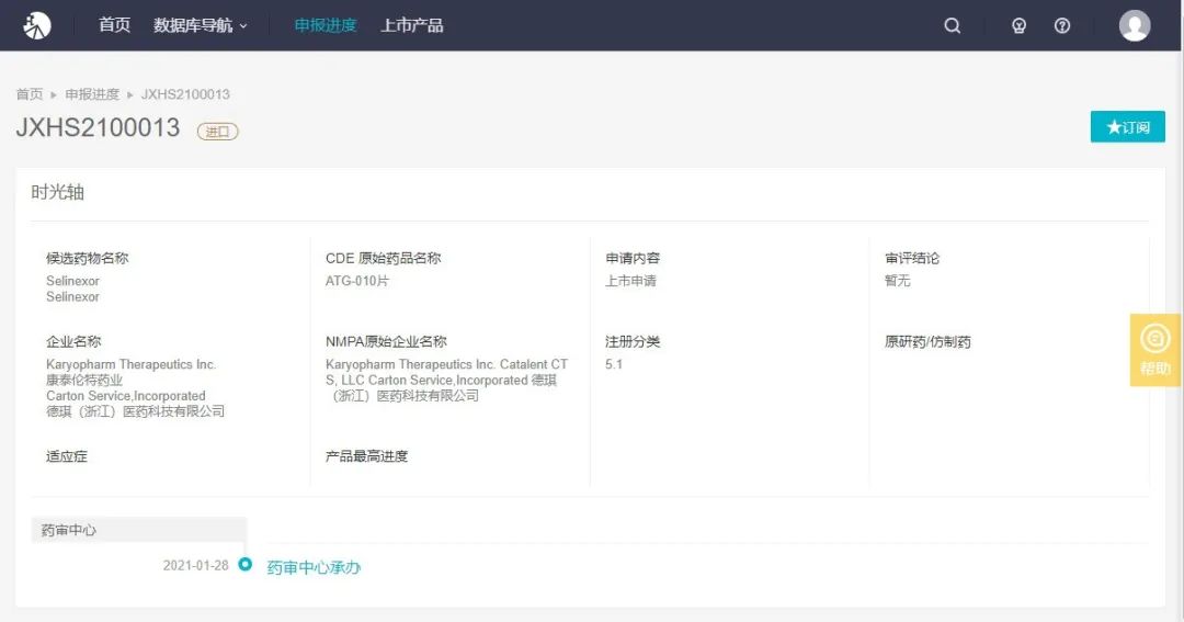 1 月 28 日,德琪医药-B 公布,国家药监局已受理该公司 ATG-010 (selinexor) 用于治疗复发难治性多发性骨髓瘤(rrMM)的新药上市申请,受理号 JXHS2100013。