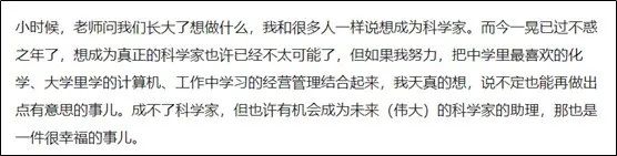 「而今一晃已过不惑之年,想成为真正的科学家也许已经不太可能了。但如果我努力,把中学里最喜欢的化学、大学里学的计算机、工作中学习的经验管理结合起来,我天真地想,说不定也能再做出点有意思的事儿。成不了科学家,但也许有机会成为未来(伟大)的科学家的助理,那也是一件很幸福的事儿。」