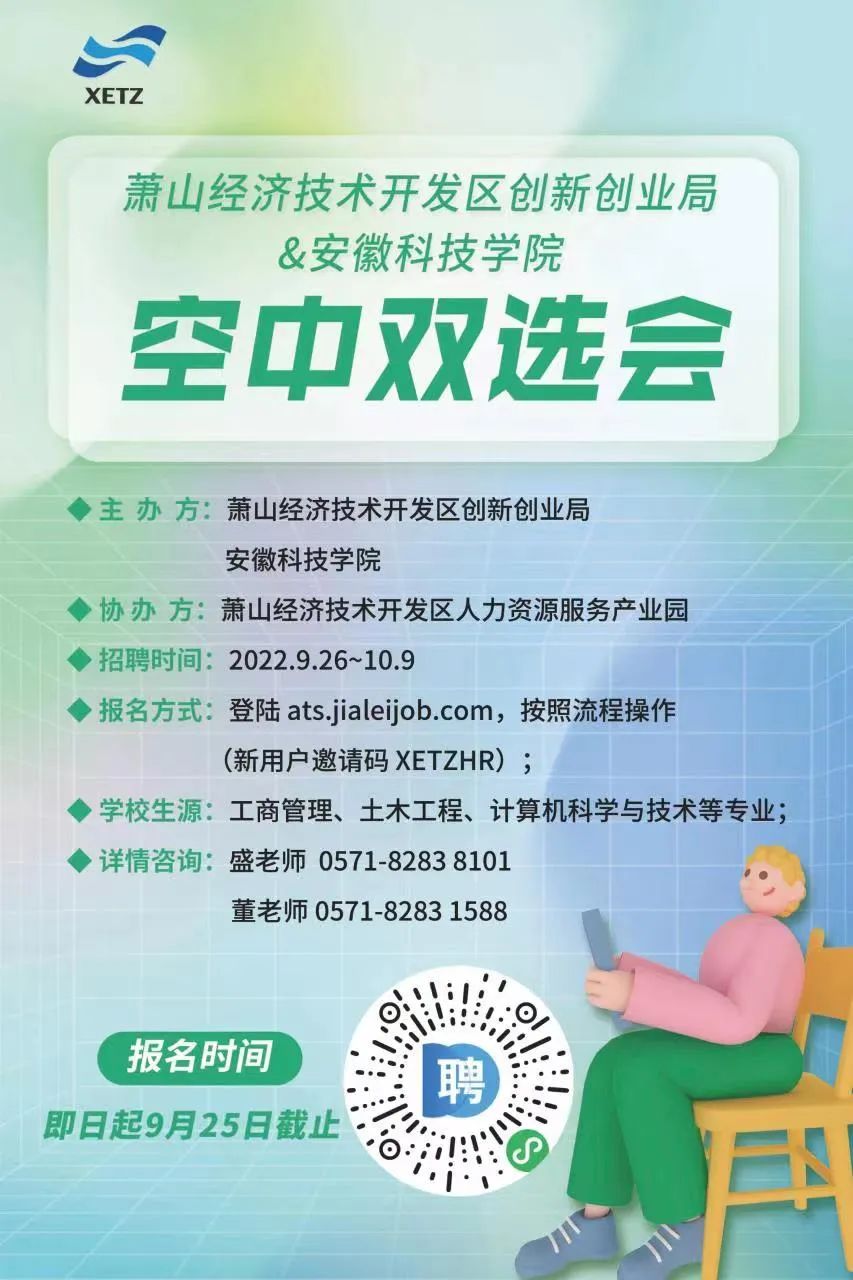 为进一步加大开发区人才引进工作力度,拓宽企业招聘渠道,缓解企业招工用工难题,为毕业生与企业搭建双向选择的空中桥梁,为经济社会高质量发展提供强有力的人才保障,结合当前疫情防控形势,萧山经济技术开发区创新创业局决定开展安徽科技学院空中双选会。现将有关事项通知如下: