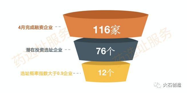 经过火石创造数据模型筛查发现,排除二级市场融资企业数量4月完成融资案例企业116家,其中有潜在投资选址意向的企业为76家,占完成融资企业数量的65.5% ;其中90%以上选址概率企业12家,占4月完成融资企业总数的10.3% 。