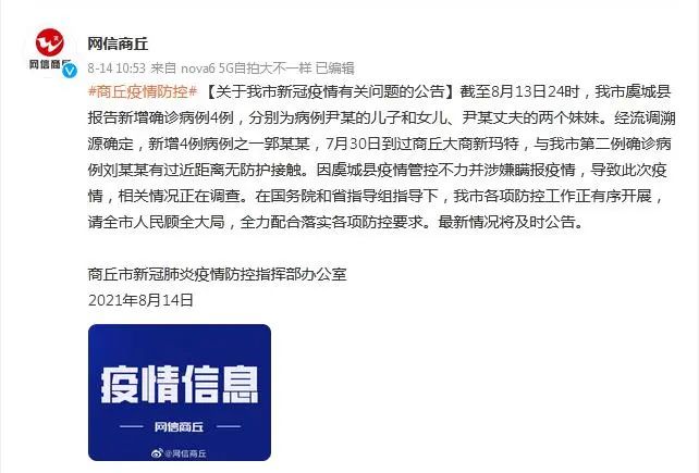 8月14日,河南省商丘市新冠肺炎疫情防控指挥部办公室发布公告称,截至8月13日24时,商丘市虞城县报告新增确诊病例4例,分别为病例尹某的儿子和女儿、尹某丈夫的两个妹妹。