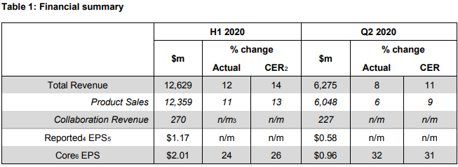 7月30日,阿斯利康发布了上半年财报。2020 Q2: