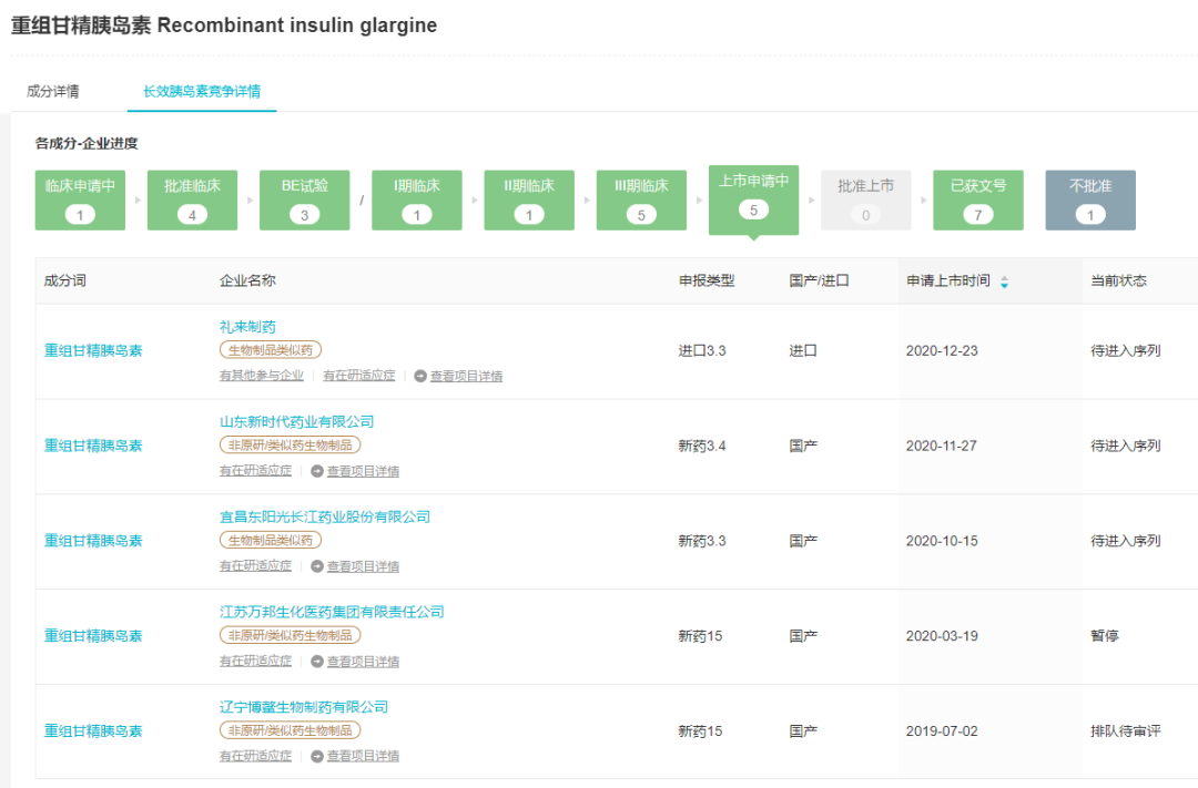 甘精胰岛素是胰岛素集采的品种之一,当前共 4 家企业获批,包括原研企业赛诺菲以及 3 家国内企业:甘李药业、通化东宝和联邦制药。东阳光紧随其后,不知获批之后是否有机会赶上第六轮集采。