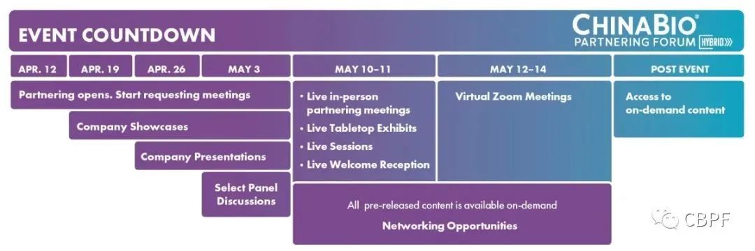 第十三届ChinaBio合作论坛组合版,将以崭新的线下和线上双重模式举行。活动前两天参会者可面对面互动,后三天则线上轻松进行虚拟合作会议,参加公司路演以及各种实时和按需点播的丰富会议议程。这将帮助您找到生命科学行业价值链中的领先者,与他们会面并建立联系,从而加速您的跨境合作伙伴关系并进一步延伸您在中国市场的触角。