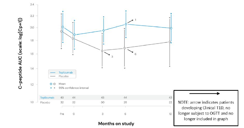 在安慰剂组,这种下降在进入研究后的6个月内仍在继续。相比之下,Teplizumab治疗组的C-肽AUC在这一时期有所上升(相对于研究开始时,P=0.02)。