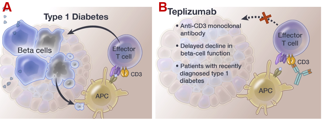 首先,是基础研究扎实、顶层设计合理。从作用机制上来说,I型糖尿病是一种免疫性疾病,Teplizumab参与免疫调节,通过缓解胰岛细胞免疫浸润来缓解I型糖尿病是可行的,尽管其调控的具体分子机制是通过后来的试验一步一步阐明的,但大方向一直是正确的。