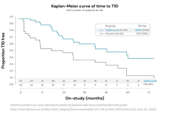 试验结果显示,在51个月的中位随访中,接受Tzield的44名患者中有45%后来被诊断为3期1型糖尿病,而接受安慰剂的32名患者中有72%被诊断为3期糖尿病。