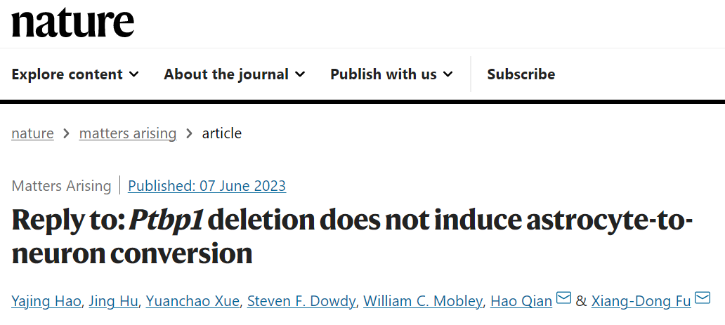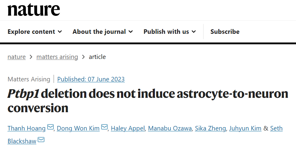 2023年6月7日,约翰·霍普金斯大学医学院 Seth Blackshaw 团队在 Nature 发表了题为:Ptbp1 deletion does not induce astrocyte-toneuron conversion 的文章