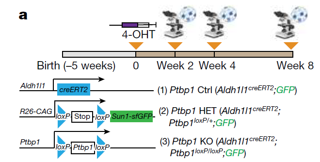 为了从基因上破坏星形胶质细胞中Ptbp1的功能,研究团队使用了星形胶质细胞特异性他莫昔芬诱导的