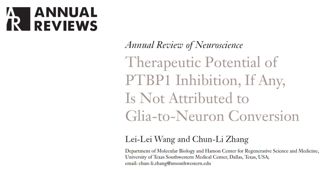 今年1月份,张春立教授在 Annual Review of Neuroscience 期刊发表了题为:Therapeutic Potential of PTBP1 Inhibition, If Any, Is Not Attributed to Glia-to-Neuron Conversion 的综述论文