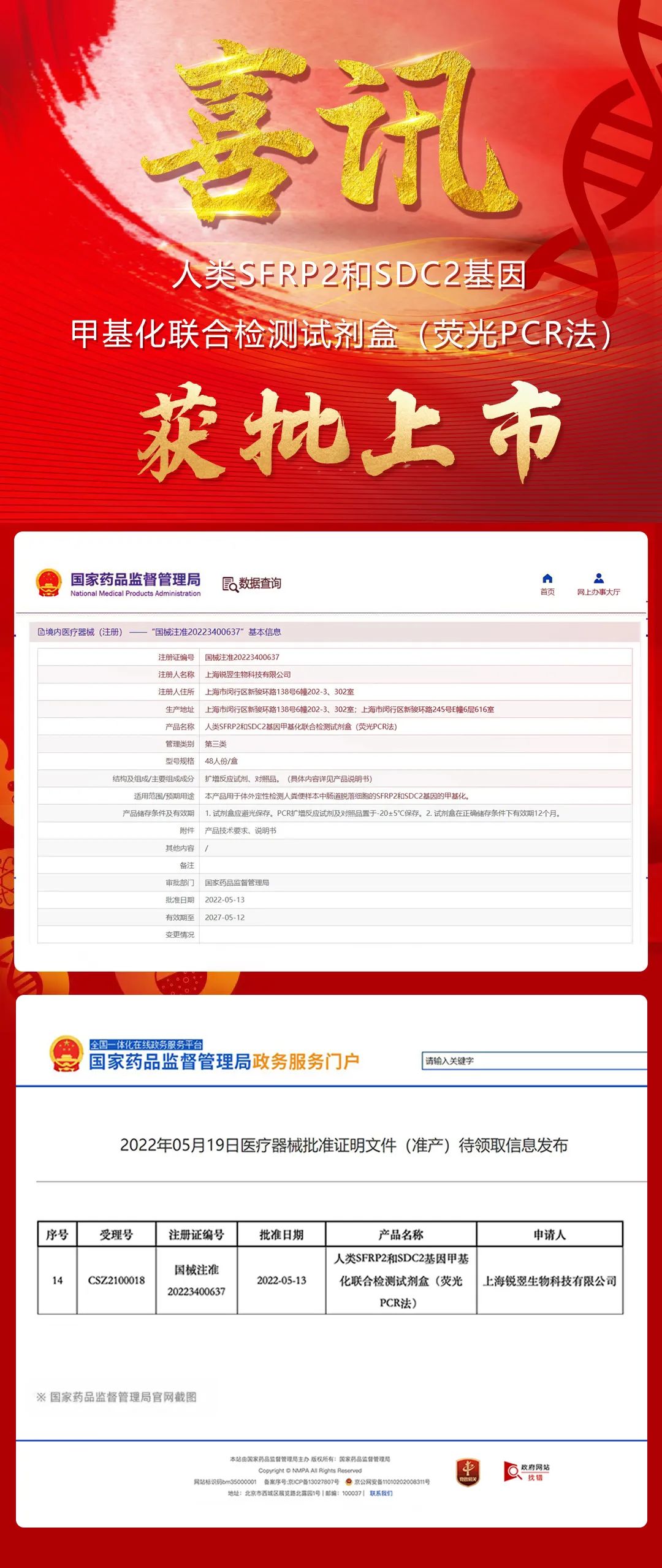 5月13日,上海锐翌生物科技有限公司自主研发的人类SFRP2和SDC2基因甲基化联合检测试剂盒(荧光PCR法),经国家药品监督管理局(NMPA)批准,获得三类医疗器械注册证,注册证号为:国械注准20223400637。