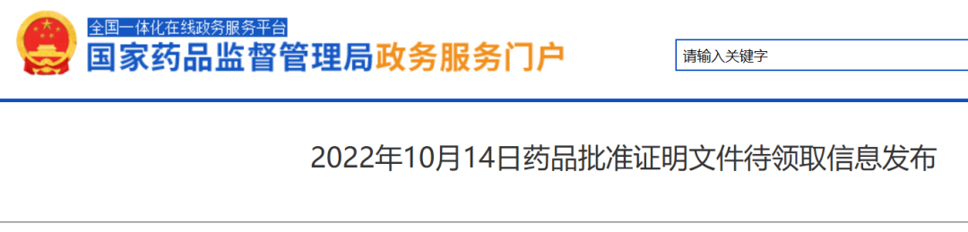 [1]2022年10月14日药品批准证明文件待领取信息发布 .Retrieved Oct 14, 2022, from https://www.nmpa.gov.cn/zwfw/sdxx/sdxxyp/yppjfb/20221014084940154.html