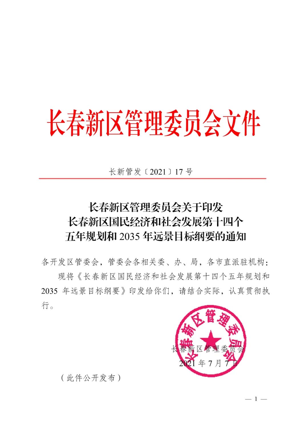 长春新区管理委员会关于印发长春新区国民经济和社会发展第十四个五年规划和2035年远景目标纲要的通知