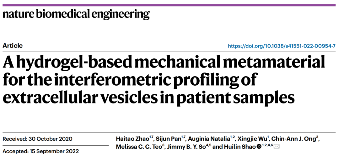 2022年10月27日,新加坡国立大学邵慧琳教授、赵海涛博士等在Nature Biomedical Engineering杂志上发表了题为A hydrogel-based mechanical metamaterial for the interferometric profiling of extracellular vesicles in patient samples的研究论文,提出了一种基于机械超材料屈曲放大效应的纳米分子分析平台(MORPH)。该平台通过光热效应将水凝胶机械超材料的初始状态精准的调控至发生图形转换的临界状态,并将目标生物分子作为打破该临界状态的触发因素,从而获得显著的敏感机械形变,来达到放大微弱生物信号的目的。