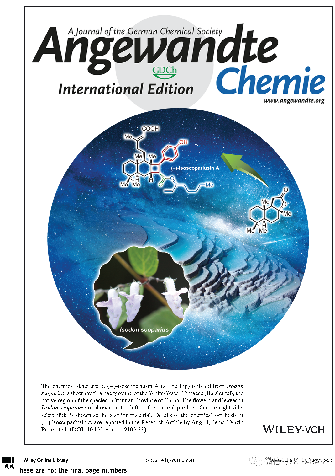 近日,相关研究成果以“(-)-Isoscopariusin A, a Naturally Occurring Immunosuppressive Meroditerpenoid: Structure Elucidation and Scalable Chemical Synthesis”为题在国际著名期刊《德国应用化学》(Angewandte Chemie Internal Edition)上发表(2021年3月8日在线),并入选封面文章(Front Cover,图2)。中科院昆明植物研究所(KIB,CAS)为第一通讯单位,颜秉超博士(KIB)和周敏博士(KIB)为共同第一作者,普诺·白玛丹增研究员和中科院上海有机所李昂研究员为共同通讯作者。