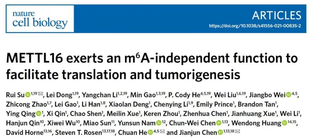 2022年2月10日,美国希望之城国家医疗中心(City of Hope National Medical Center)的陈建军教授、苏瑞助理教授,以及美国芝加哥大学(The University of Chicago)的何川教授合作研究,于Nature Cell Biology杂志在线发表了题为 METTL16 exerts an m6A-independent function to facilitate translation and tumorigenesis 的研究论文,揭示了METTL16同时具备m6A甲基转移酶功能依赖(m6A-dependent)以及非甲基转移酶依赖(m6A-independent)的功能。在细胞核中,METTL16可以作为“书写器”参与催化mRNA特别是新生(nascent)mRNA的m6A修饰;而在细胞质中,METTL16通过与翻译起始因子3a/b(eukaryotic initiation factor 3a/b)及核糖体RNAs (rRNAs)直接结合促进80S核糖体的组装从而促进蛋白质的翻译效率。同时,体内外实验表明METTL16在肿瘤(如肝癌)的发生发展中也发挥了重要的促癌基因的作用。