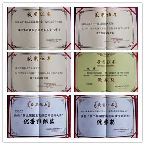 “潍坊高新区发布”微信公众号被评为国家高新区微信公众号综合影响力领先奖,“潍坊高新技术产业开发区网站”被评为国家高新区门户网站综合影响力领先奖,《潍坊高新区:十年磨一剑 他拿出一批“全球立得住的核心技术”》被评为国家高新区新闻作品优秀奖。