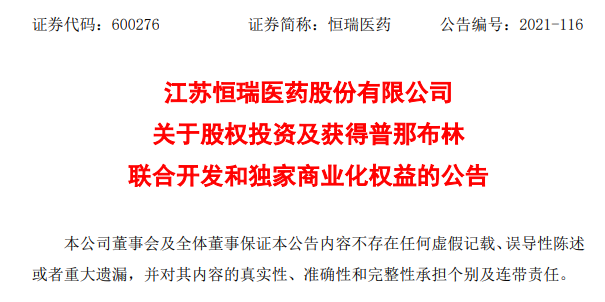 8月26日,江苏恒瑞医药股份有限公司发布了关于关于股权投资及获得普那布林联合开发和独家商业化权益的公告。
