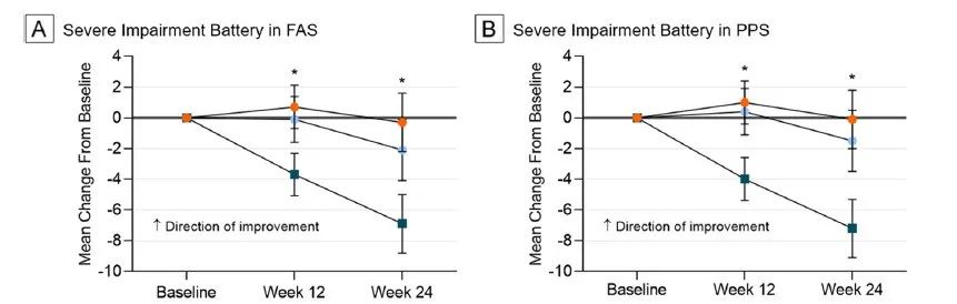 ▲接受不同剂量GV1001或安慰剂治疗的患者的SIB评分变化,橘色为最高剂量GV1001治疗组,深蓝色为对照组(图片来源:参考资料[2])