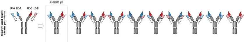 双链错配问题。天然抗体由四条多肽链组成,分子量较大的两条称为重链(H链),分子量较小的两条链称为轻链(L链)。在单抗结构中,两条重链和轻链的氨基酸组成完全相同,四条链组合后仅有一种结构。而双抗的开发是通过共表达两条不同的重链和两条不同的轻链,以此来实现同时特异性结合2个不同抗原的目的。因此在四条链组装的过程中,2条重链和2条轻链可随机产生16种可能的结构,即使将其中互为镜像的结构合并后,仍然有10种结构不同,但生化特性极为相似的抗体结构,因此从中分离出一种目标产物的难度极大。这种现象在单抗制备中并不常见,其也是造成双抗产量低、有杂质蛋白、生产成本较高的根本原因。