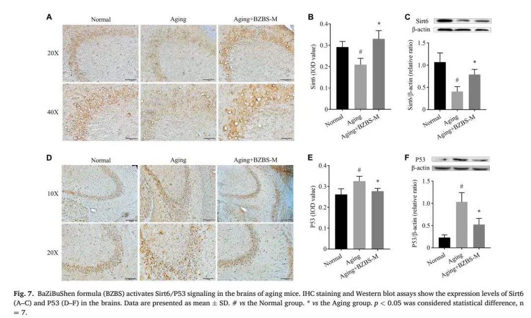 最新研究发现,寿命长短与沉默调节蛋白6(Sirt6)蛋白密切相关,其被称为“长寿蛋白”。Sirt6通过抗癌基因P53及其下游效应因子、端粒酶逆转录酶(TERT)起到保持DNA稳定性和端粒完整性的作用,P53的不稳定可导致Sirt6表达减少,进而诱发机体衰老。研究显示TERT活性降低也会影响线粒体功能、氧化还原动态平衡及端粒完整性。可见,提高Sirt6和TERT基因蛋白表达水平有可能恢复机体活力,减轻衰老引起的多种病理改变,对于保持DNA稳定性和端粒完整性,以及延长寿命具有重要意义。通过建立D-gal和亚硝酸钠(NaNO2)诱导的衰老小鼠模型评价八子补肾胶囊的作用,结果显示八子补肾胶囊能够上调海马和肝脏组织中的长寿蛋白Sirt6的表达水平,降低衰老相关蛋白P53的表达水平,上调TERT蛋白表达水平。表明八子补肾胶囊可能通过上调Sirt6水平,下调P53表达,上调TERT蛋白表达而促进DNA损伤修复并提高端粒酶活性,从而发挥抗衰老作用。