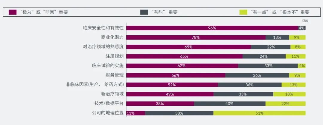 生物医药领域的投资者在为投资进行产品评估时,将临床研究证实的安全性与有效性、产品的商业化潜力以及对药物治疗领域(TA)的熟知度列为首要考量的三项标准。那些定期对尚未被临床使用的产品进行评估的投资公司也表示目标治疗领域这一因素非常重要。