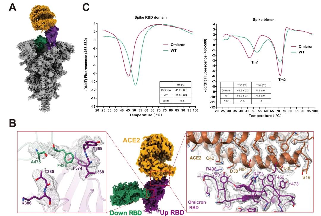 ,可以稳定Omicron变异株的刺突蛋白特定的RBD处于开放的状态;热动力学实验显示,Omicron变异株的RBD高度灵活,且不稳定,其热溶解温度降了超过5 °C