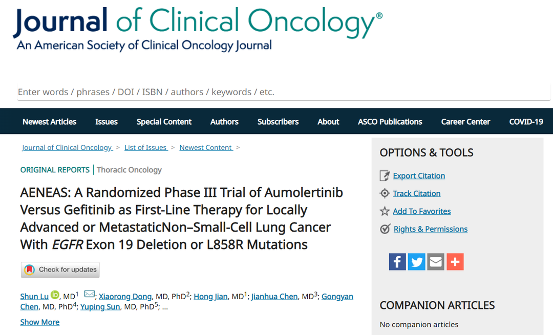 2022年5月18日,国际著名肿瘤学期刊《临床肿瘤学杂志》(Journal of Clinical Oncology,JCO,IF:44.544)在线发表了上海交通大学附属胸科医院陆舜教授主导的翰森制药创新药甲磺酸阿美替尼AENEAS研究论文。这是ASCO官方期刊首次发表中国原创三代EGFR-TKI临床数据。