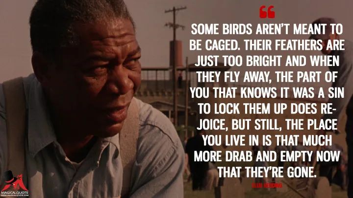 有的鸟是不会被关住的,因为它们的羽毛太美丽了!(Some birds aren't meant to be caged, that'sall. Their feathers are just too bright...)。