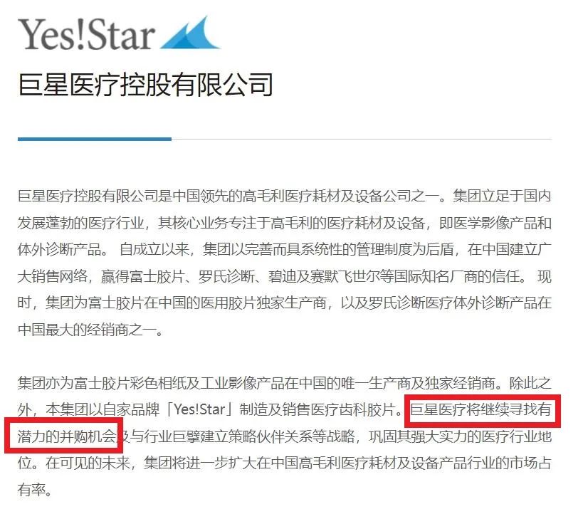 巨星医疗是一家在香港联合交易所有限公司主板上市的股份有限公司(股份简称:巨星医疗控股,股份代号:2393,当前市值为24.7亿港元)。由印尼华人何震发家族创立,是罗氏中国区业务的最大分销商,同时也是日本富士胶片中国最大的经销制造商。