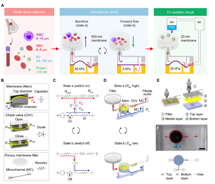 研究人员制作的微流控装置完全由气动时钟脉冲发生器驱动,可以在30分钟内直接从血液中高产、高纯度的分离EVs。通过使用热敏感应器检测患者血液中分离的EVs的蛋白质标记物来证明其临床效用,诊断早期乳腺癌的准确性高达91%。