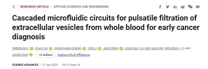 4月21日,中国科学院大学研究团队在《Science Advances》上发表了名为“Cascaded microfluidic circuits for pulsatile filtration of extracellular vesicles from whole blood for early cancer diagnosis”的文章,研究人员称通过使用传感器检测从患者血液中分离的EV蛋白质标记物,诊断早期乳腺癌的准确率为91%,而且在EVs研究领域有广阔的应用前景。