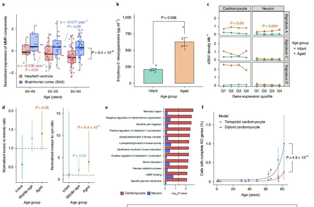该研究使用单细胞全基因组测序技术鉴定了人类心脏在衰老过程中的体细胞突变,发现心肌细胞的体细胞单核苷酸突变(sSNV)会随着年龄的增长比许多分裂细胞和非分裂神经元以更快的速度积累。而且,心肌细胞具有提示DNA氧化损伤和DNA修复机制受损的突变以及碱基替换增加的突变特征,所有这些都会随年龄增长而累积。