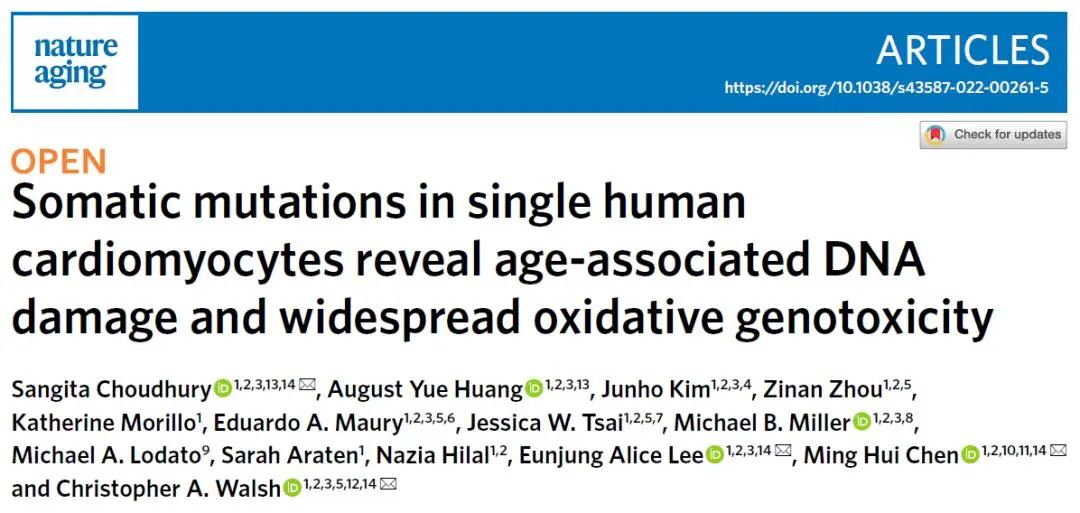 2022年8月11日,波士顿儿童医院、哈佛医学院、Broad研究所等机构的研究人员在 Nature 子刊 Nature Aging 发表了题为:Somatic mutations in single human cardiomyocytes reveal age-associated DNA damage and widespread oxidative genotoxicity 的研究论文。
