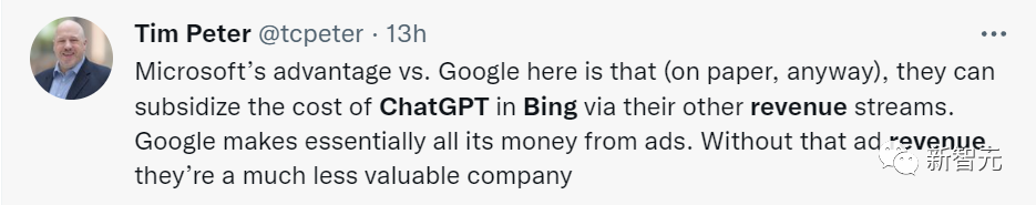 而针对如何盈利的问题,数字营销专家Tim Peter倒是在推特上指出,微软的优势在于可以通过其他收入来源,来补贴必应中ChatGPT的成本。
