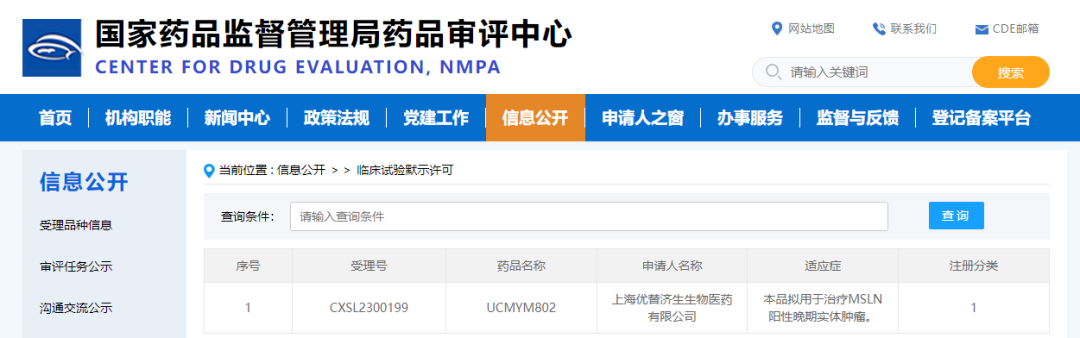 6月7日,CDE官网显示,位于张江细胞与基因产业园的上海优替济生生物医药有限公司(以下简称“优替济生”)申报的“UCMYM802”获临床试验默示许可(IND),拟用于治疗MSLN阳性晚期实体肿瘤。