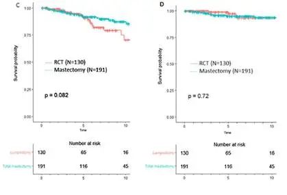 在初始治疗阶段BCT后10.7年和IBTR后6.5年的中位随访中,纳入初始肿瘤特征和治疗的多因素分析显示,无论从最初BCT和IBTR后进行手术的时间进行观察,RCT与乳房切除术的乳腺癌特异性生存(BCSS)和总生存(OS)率没有差异(图2、图3)。