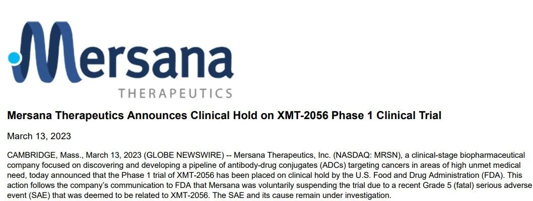 3月13日,Mersana Therapeutics 宣布已向 FDA 报告 I 期临床出现与 XMT-2056 治疗相关的 5 级(致命)严重不良事件(SAE),并自愿暂停了该项临床试验。SAE 发生在第二例患者中,具体原因仍在调查中。