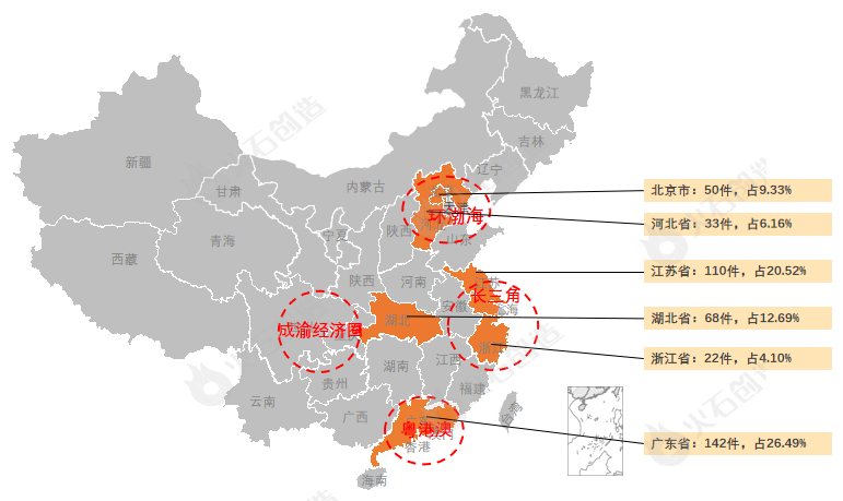 从地域分布上,2022年10月国产二、三类注册产品批件最多的依次为广东省(142件)、江苏省(110件)、湖北省(68件)三个区域,见图5。